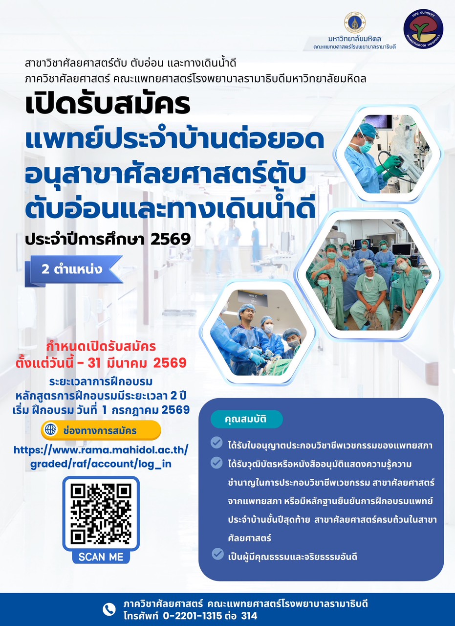 สาขาวิชาศัลยศาสตร์ตับ ตับอ่อน และทางเดินน้ำดี เปิดรับสมัครแพทย์ประจำบ้านต่อยอด อนุสาขาศัลยศาสตร์ตับ ตับอ่อน และทางเดินน้ำดี ประจำปีการศึกษา 2569 ตั้งแต่วันนี้ ถึงวันที่ 31 มีนาคม 2569 ศัลยแพทย์ที่สนใจสามารถยื่นใบสมัครผ่านระบบ Online ได้ที่ งานการศึกษาหลังปริญญา คณะแพทยศาสตร์ โรงพยาบาลรามาธิบดี มหาวิทยาลัยมหิดล https://www.rama.mahidol.ac.th/graded/raf/account/log_in