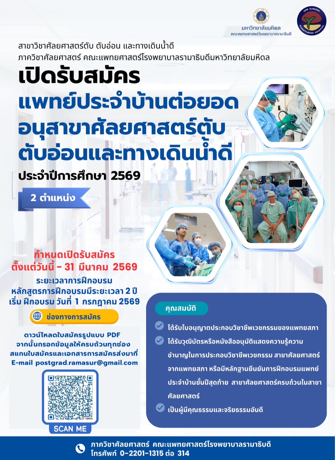 สาขาวิชาศัลยศาสตร์ตับ ตับอ่อน และทางเดินน้ำดี เปิดรับสมัครแพทย์ประจำบ้านต่อยอด อนุสาขาศัลยศาสตร์ตับ ตับอ่อน และทางเดินน้ำดี ประจำปีการศึกษา 2569 ตั้งแต่วันนี้ ถึงวันที่ 31 มีนาคม 2569 ศัลยแพทย์ที่สนใจสามารถยื่นใบสมัครผ่านระบบ Online ได้ที่ งานการศึกษาหลังปริญญา คณะแพทยศาสตร์ โรงพยาบาลรามาธิบดี มหาวิทยาลัยมหิดล