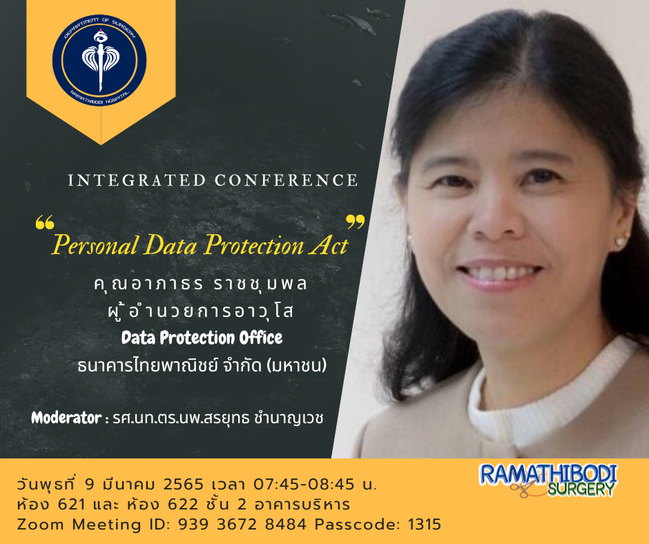 Integrated Conference : "Personal Data Protection Act" โดยคุณอาภาธร ราชชุมพล ผู้อำนวยการอาวุโส Data Protection Office ธนาคารไทยพาณิชย์ จำกัด (มหาชน) ในวันพุธที่ 9 มีนาคม 2565 เวลา 07:45-08:45 น. ณ ห้อง 621 และห้อง 622 ชั้น 2 อาคารบริหาร