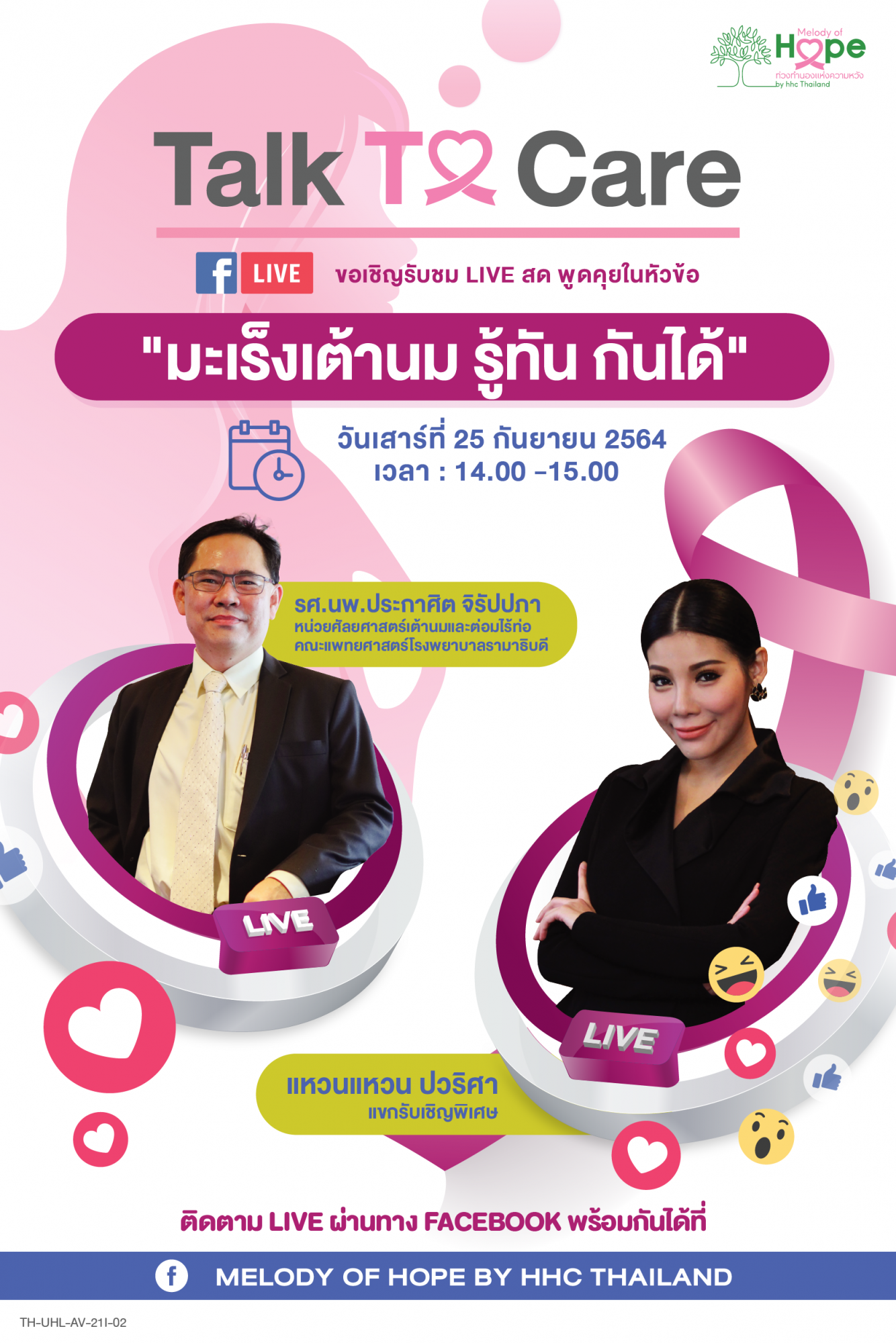 เชิญชมรายการ Talk To Care หัวข้อ ""มะเร็งเต้านม รู้ทัน กันได้" ในวันเสาร์ที่ 25 กันยายน 2564 เวลา 14:00-15:00 น.โดย รศ.นพ.ประกาศิต จิรัปปภา หน่วยศัลยศาสตร์เต้านมและต่อมไร้ท่อ คณะแพทยศาสตร์โรงพยาบาลรามาธิบดี ติดตาม LIVE ผ่านทาง FACEBOOK พร้อมกันได้ที่ MELODY OF HOPE BY HHC THAILAND TH-UHL-AV-211-02
