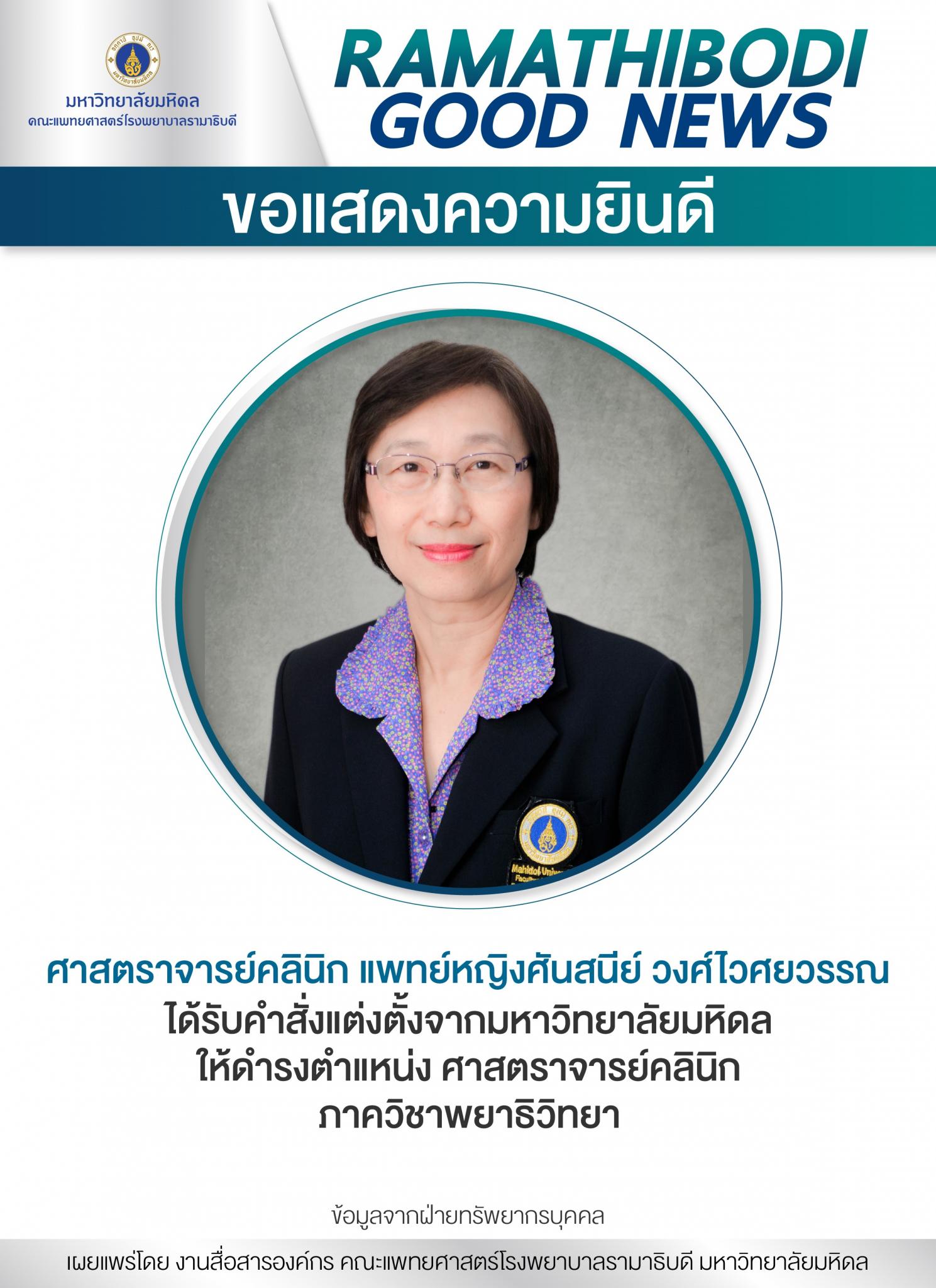 ขอแสดงความยินดี ศาสตราจารย์คลินิก แพทย์หญิงศันสนีย์ วงศ์ไวศยวรรณ