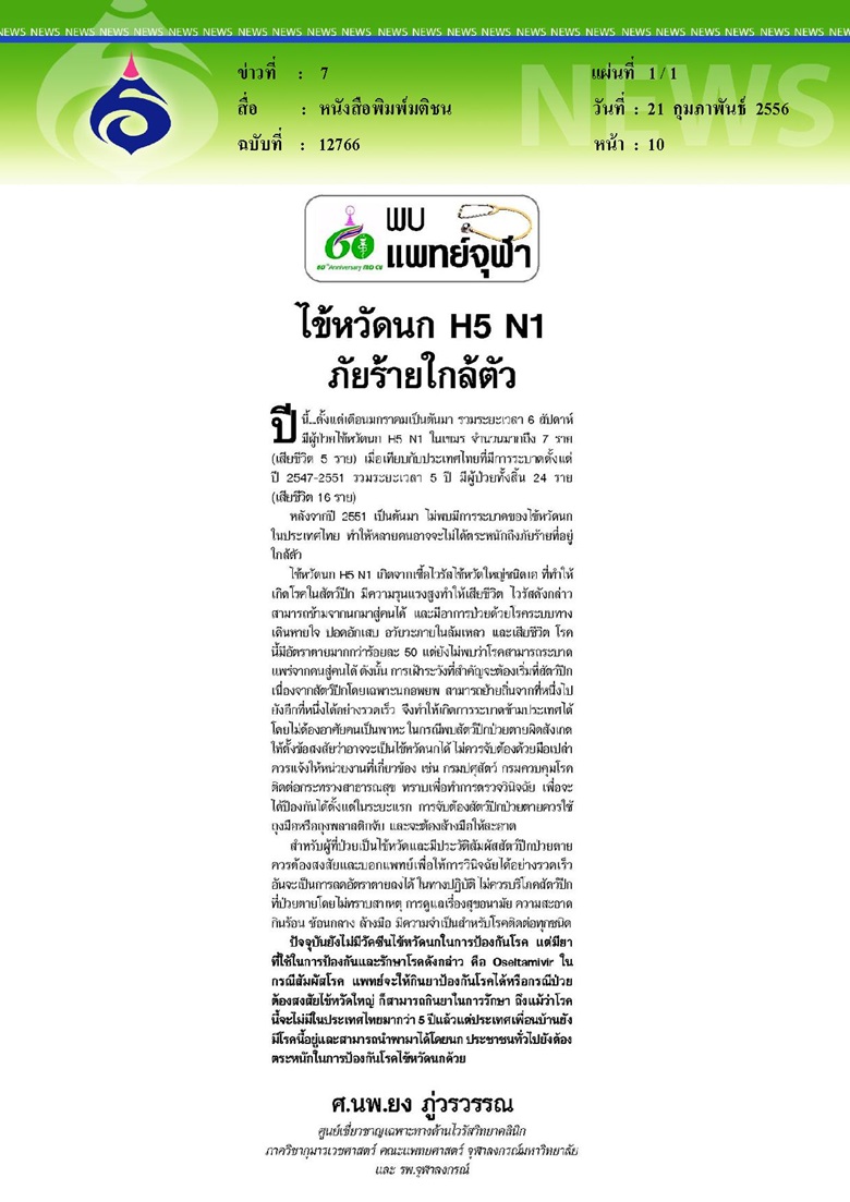 ไข้หวัดนก H5N1 ภัยร้ายใกล้ตัว