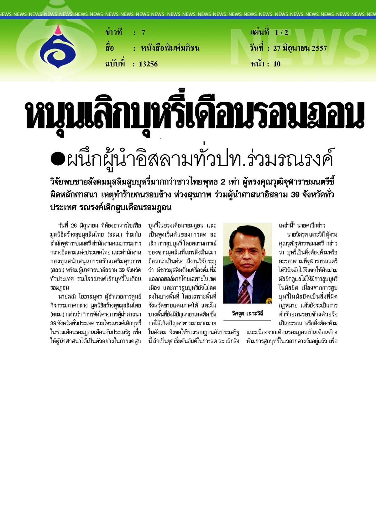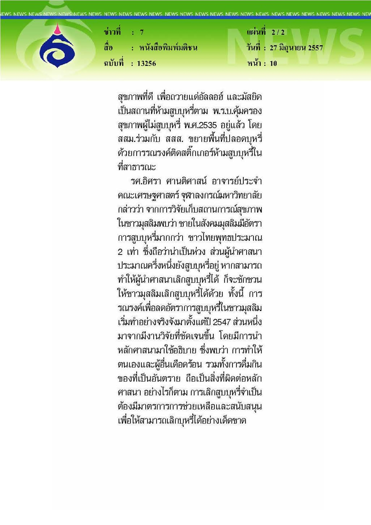 มติชน : หนุนเลิกบุหรี่เดือนรอมฎอน