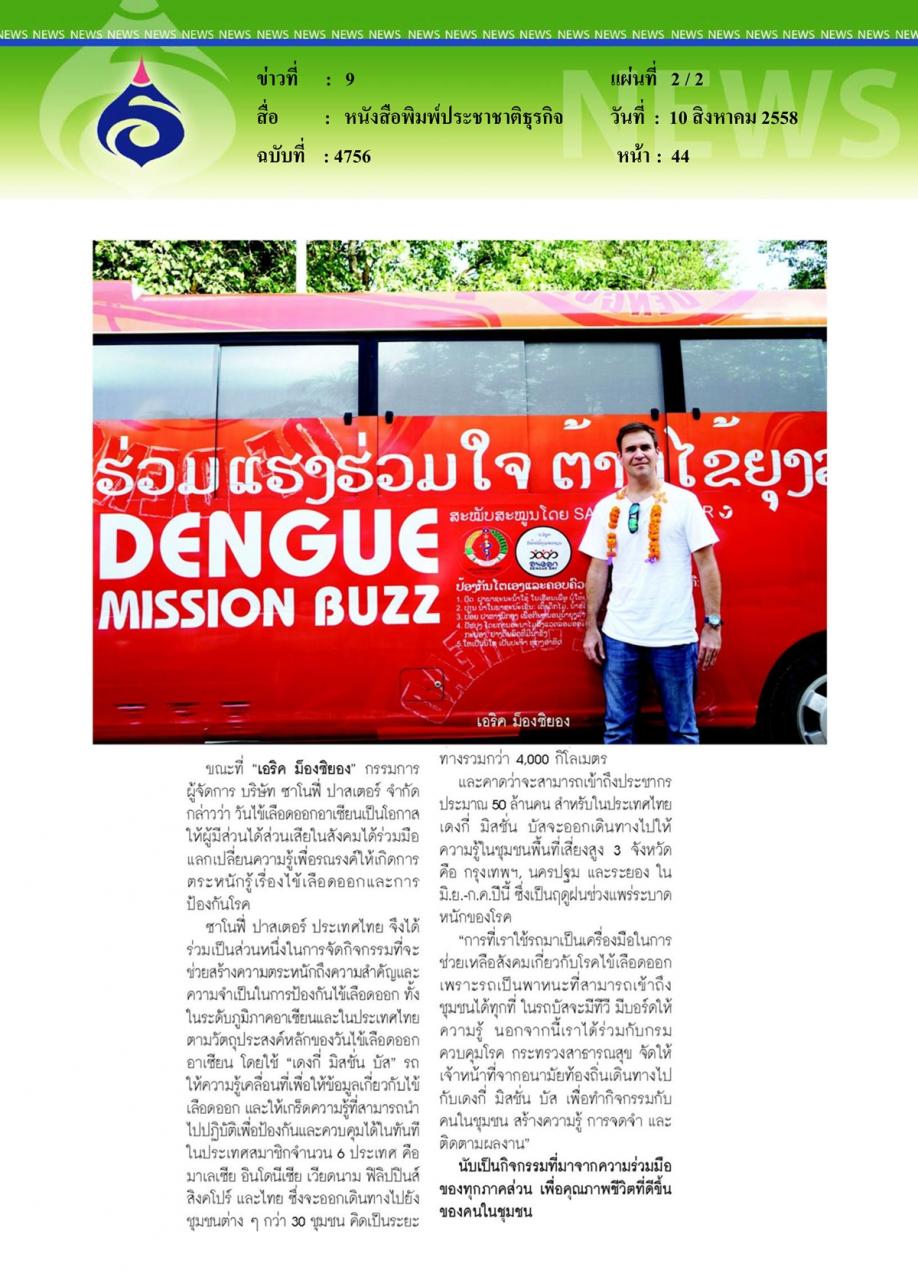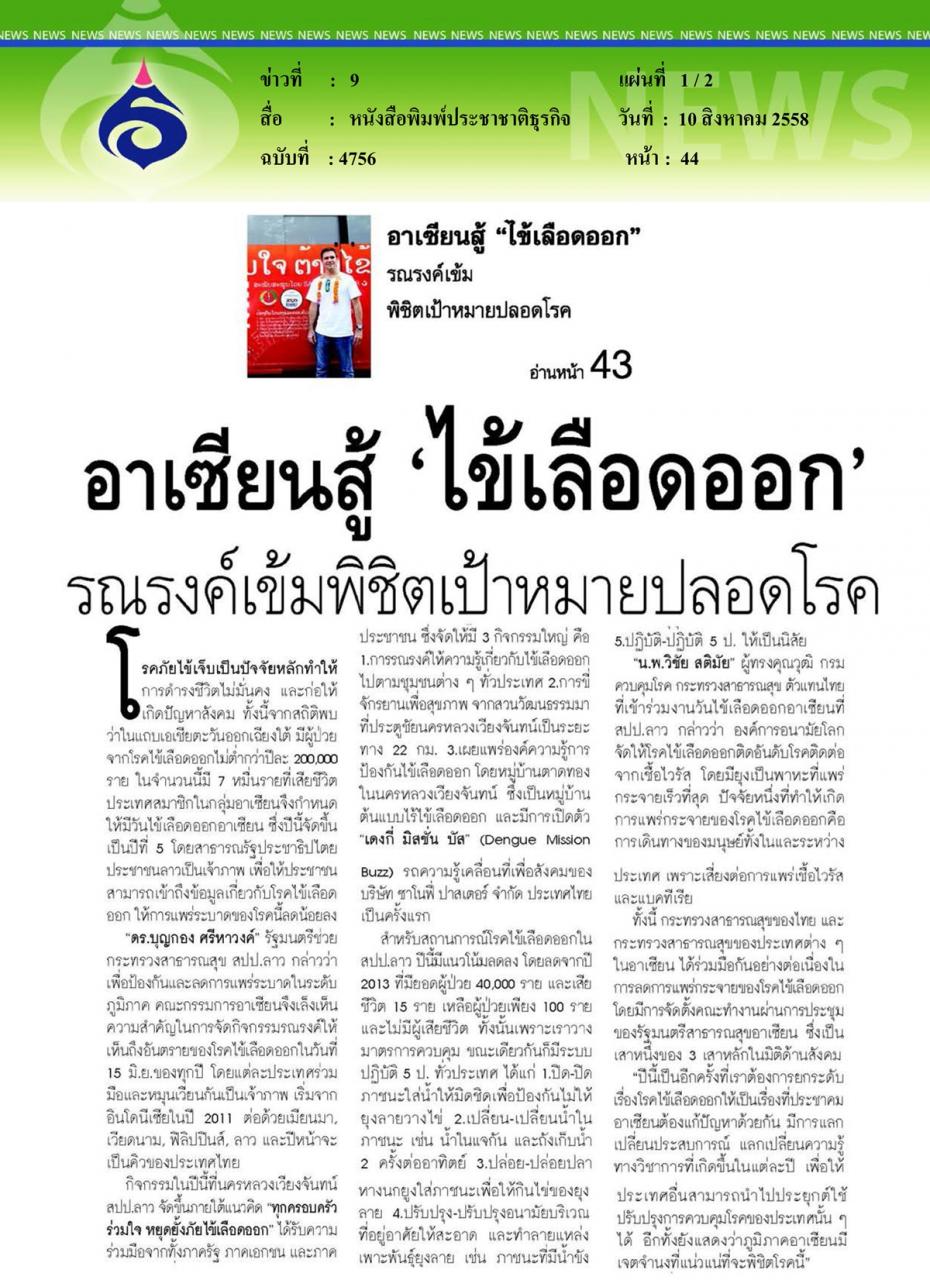 หนังสือพิมพ์ประชาชาติธุรกิจ : อาเซียนสู้ 'ไข้เลือดออก' รณรงค์เข้มพิชิตเป้าหมายปลอดโรค
