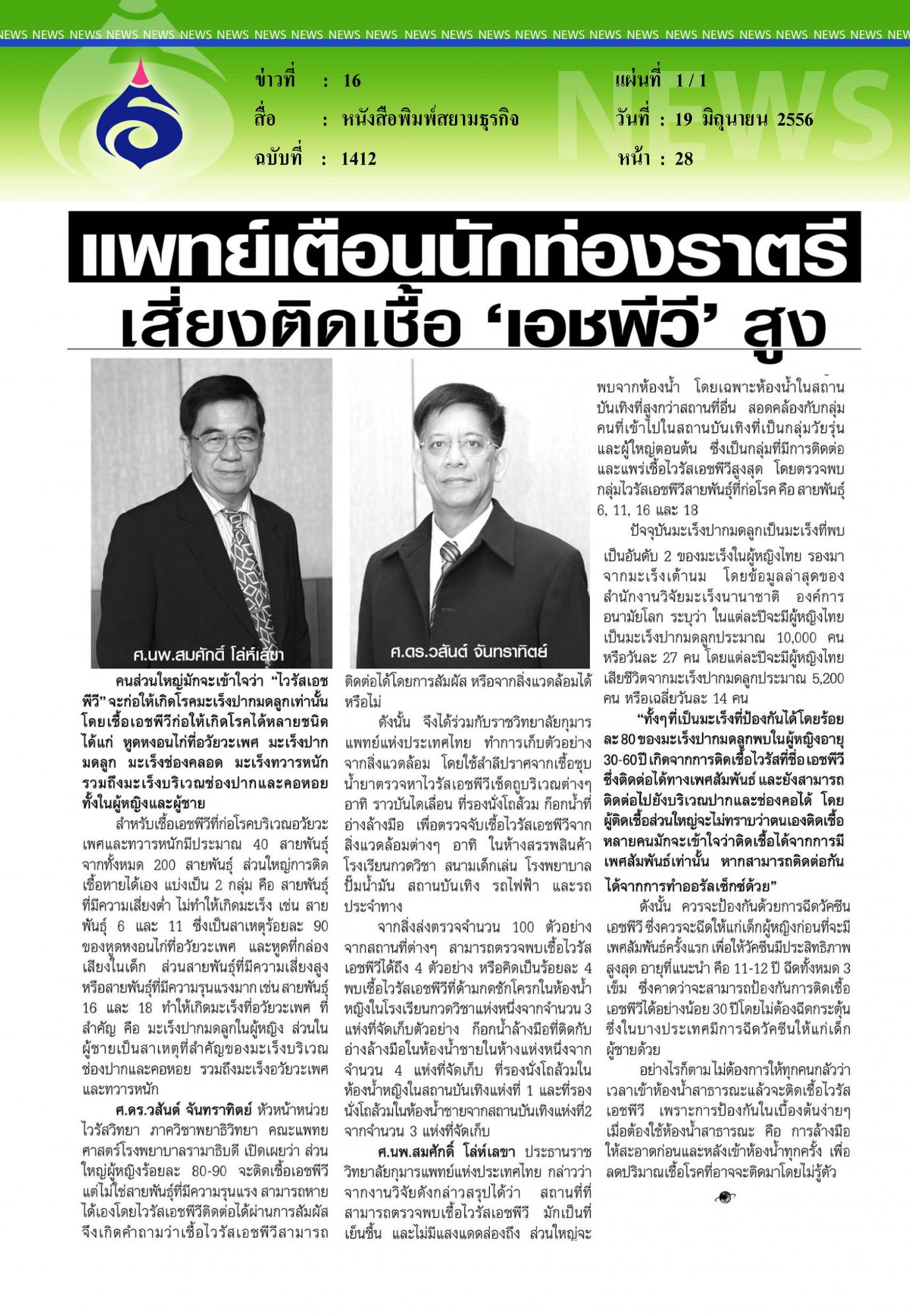 สยามธุรกิจ นักท่องราตรี เสี่ยงติดเชื้อเอชพีวีสูง