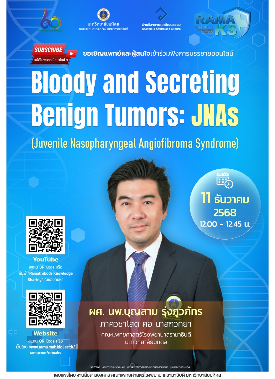 ขอเชิญแพทย์และผู้สนใจเข้าร่วมฟังการบรรยายออนไลน์ Bloody and Secreting Benign Tumors: JNAS (Juvenile Nasopharyngeal Angiofibroma Syndrome)