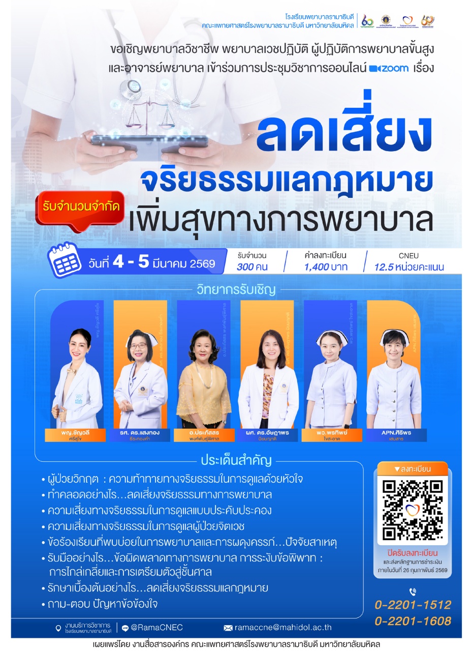 ขอเชิญเข้าร่วมการประชุมวิชาการออนไลน์ เรื่อง ลดเสี่ยงจริยธรรมแลกฎหมาย เพิ่มสุขทางการพยาบาล