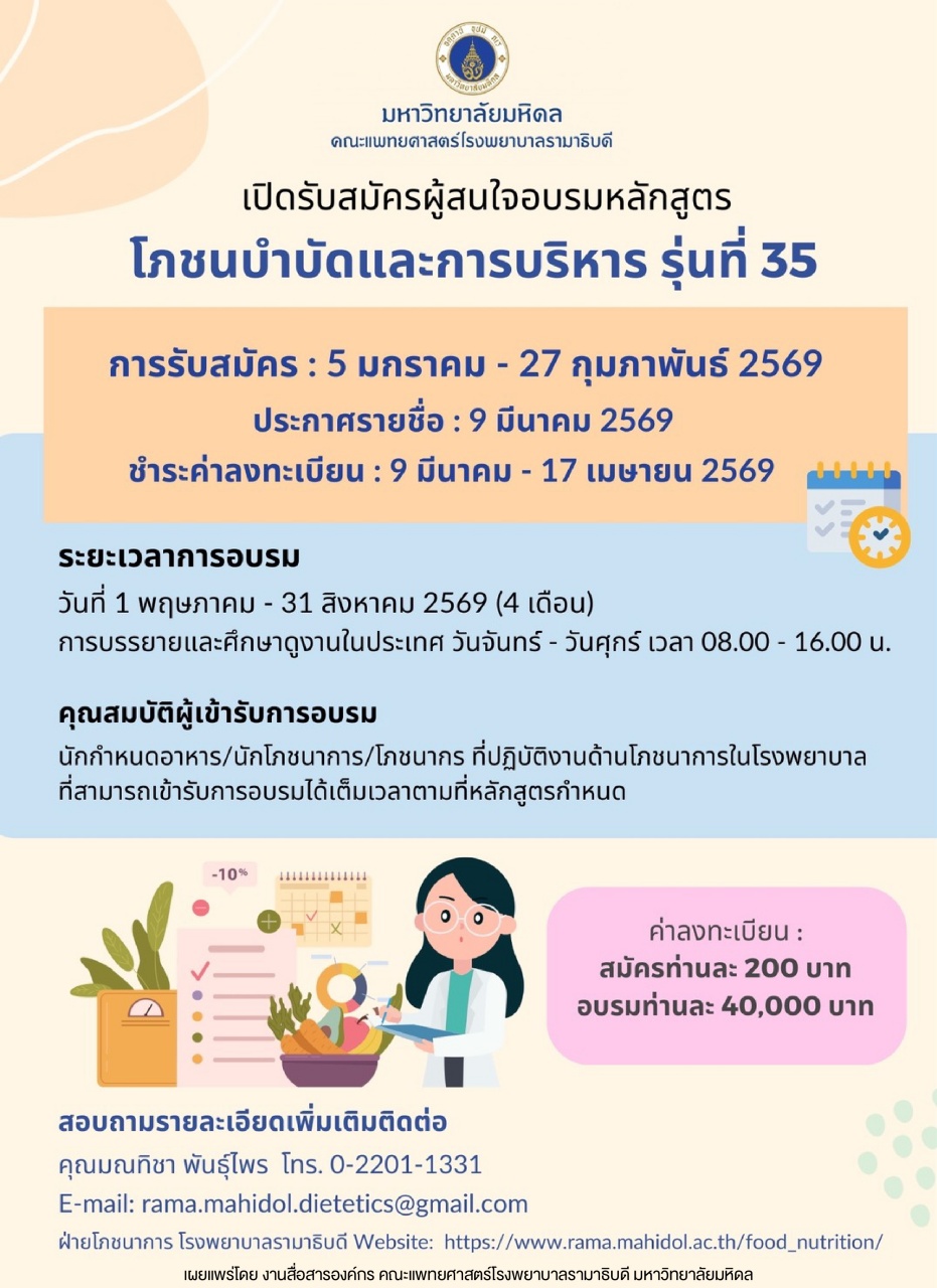 เปิดรับสมัครผู้สนใจอบรมหลักสูตร โภชนบำบัดและการบริหาร รุ่นที่ 35