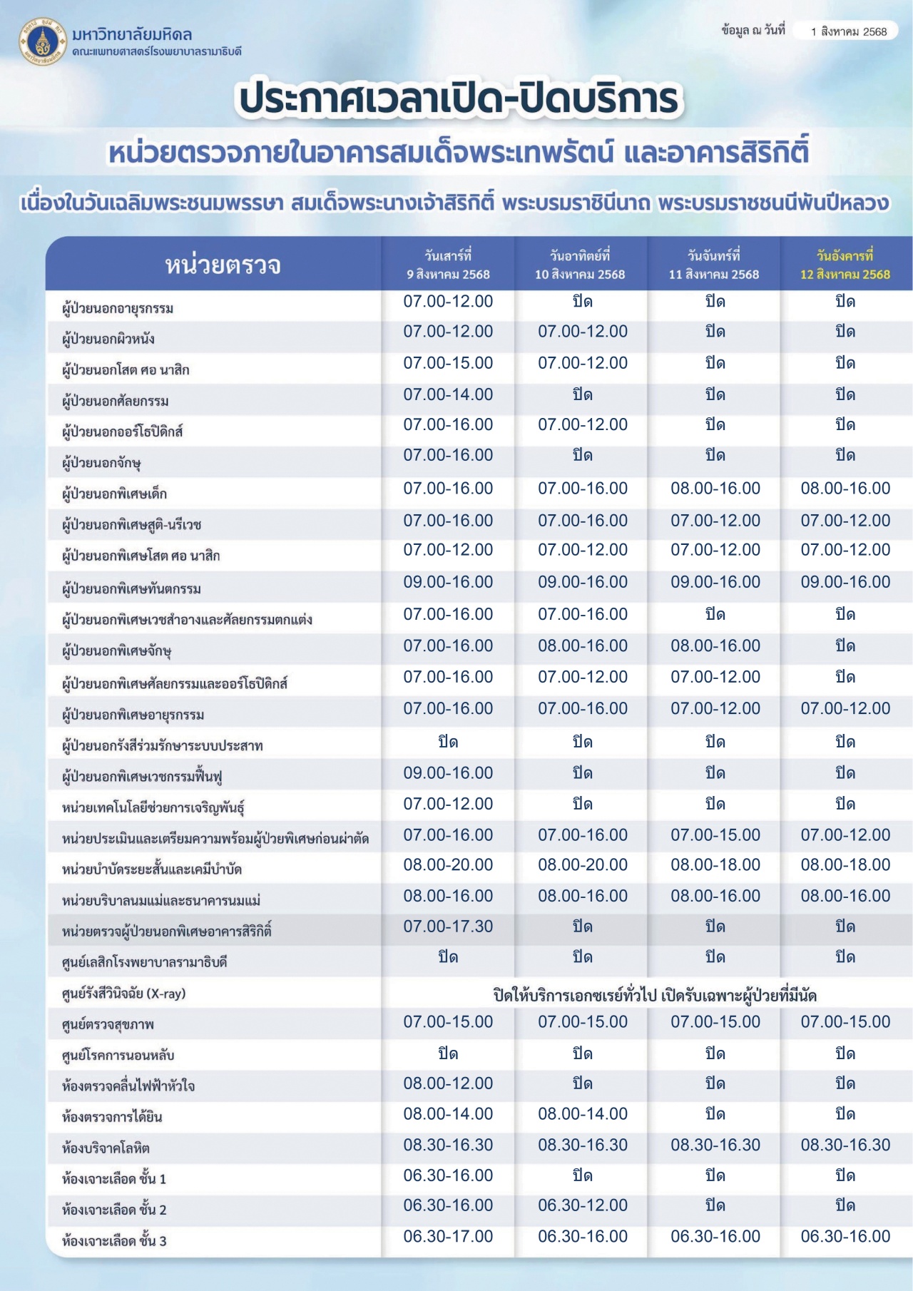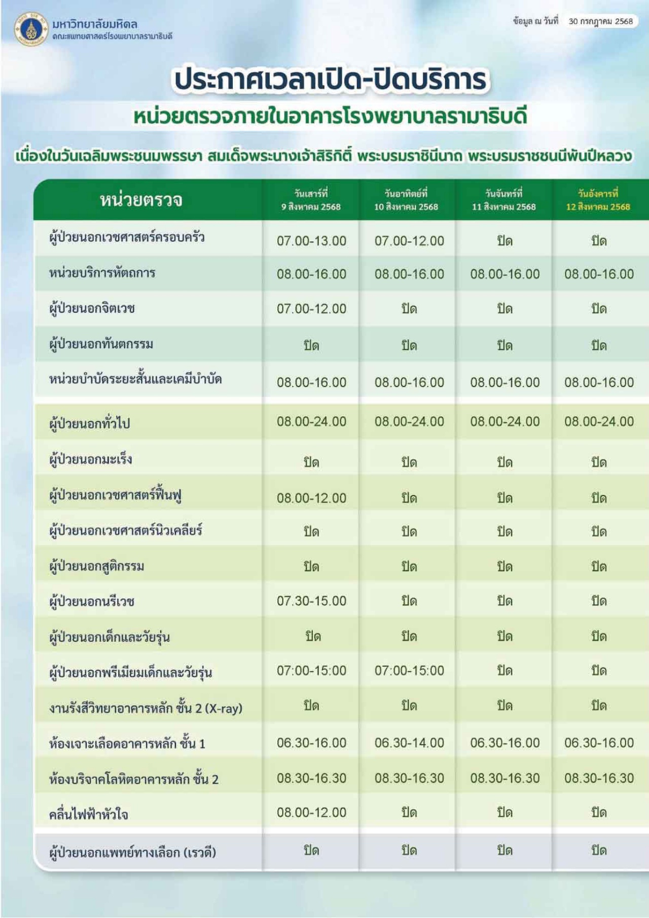 ประกาศเวลาเปิด-ปิดบริการ หน่วยตรวจภายในอาคารสมเด็จพระเทพรัตน์ อาคารสิริกิติ์ และโรงพยาบาลรามาธิบดี