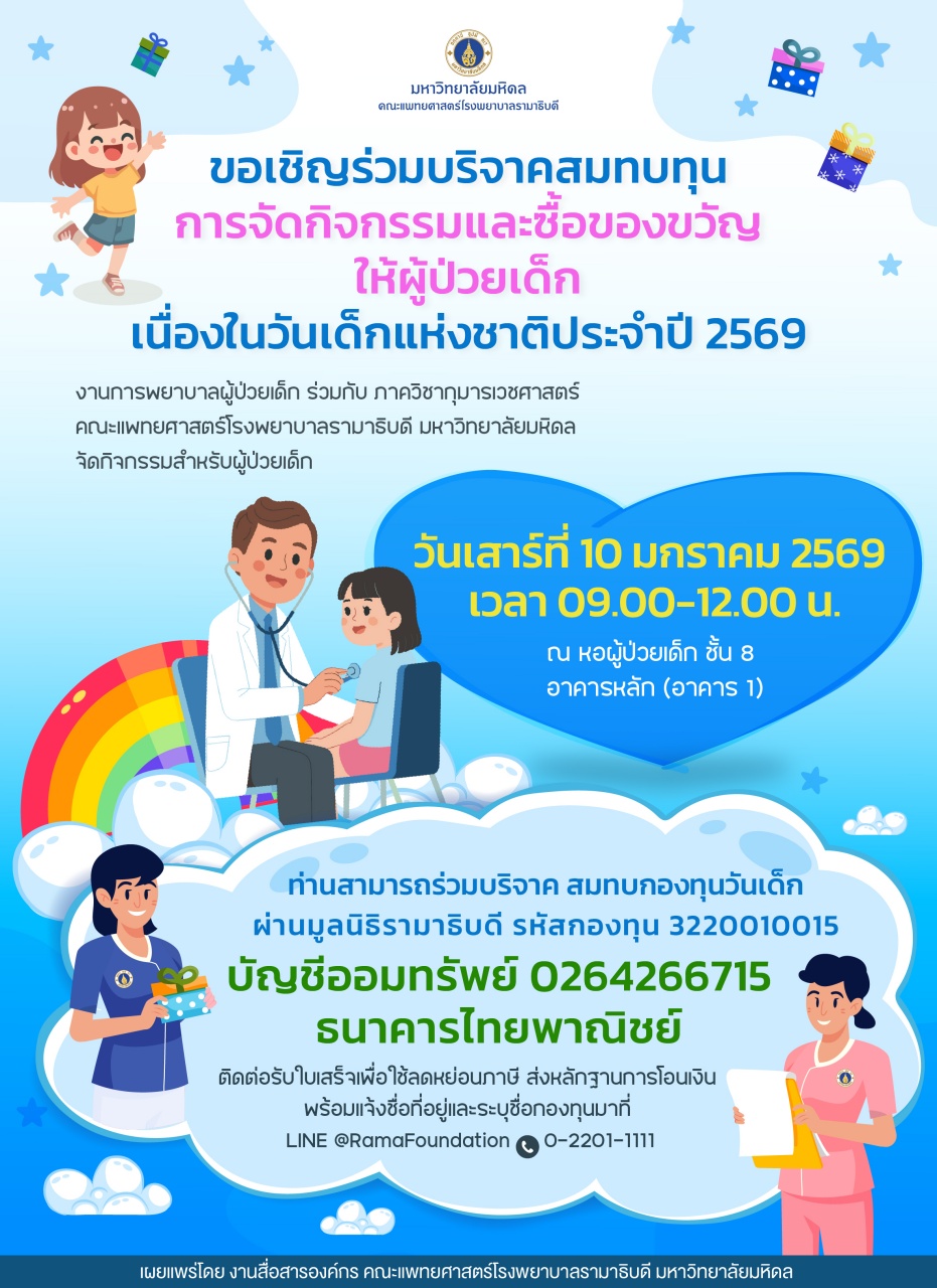 ขอเชิญร่วมบริจาคสมทบทุนการจัดกิจกรรมและซื้อของขวัญให้ผู้ป่วยเด็ก เนื่องในวันเด็กแห่งชาติประจำปี 2569