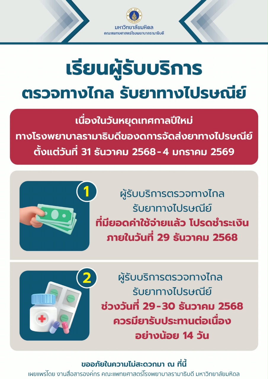 เรียนผู้รับบริการตรวจทางไกล รับยาทางไปรษณีย์ เนื่องในวันหยุดเทศกาลปีใหม่ ทางโรงพยาบาลรามาธิบดีของดการจัดส่งยาทางไปรษณีย์